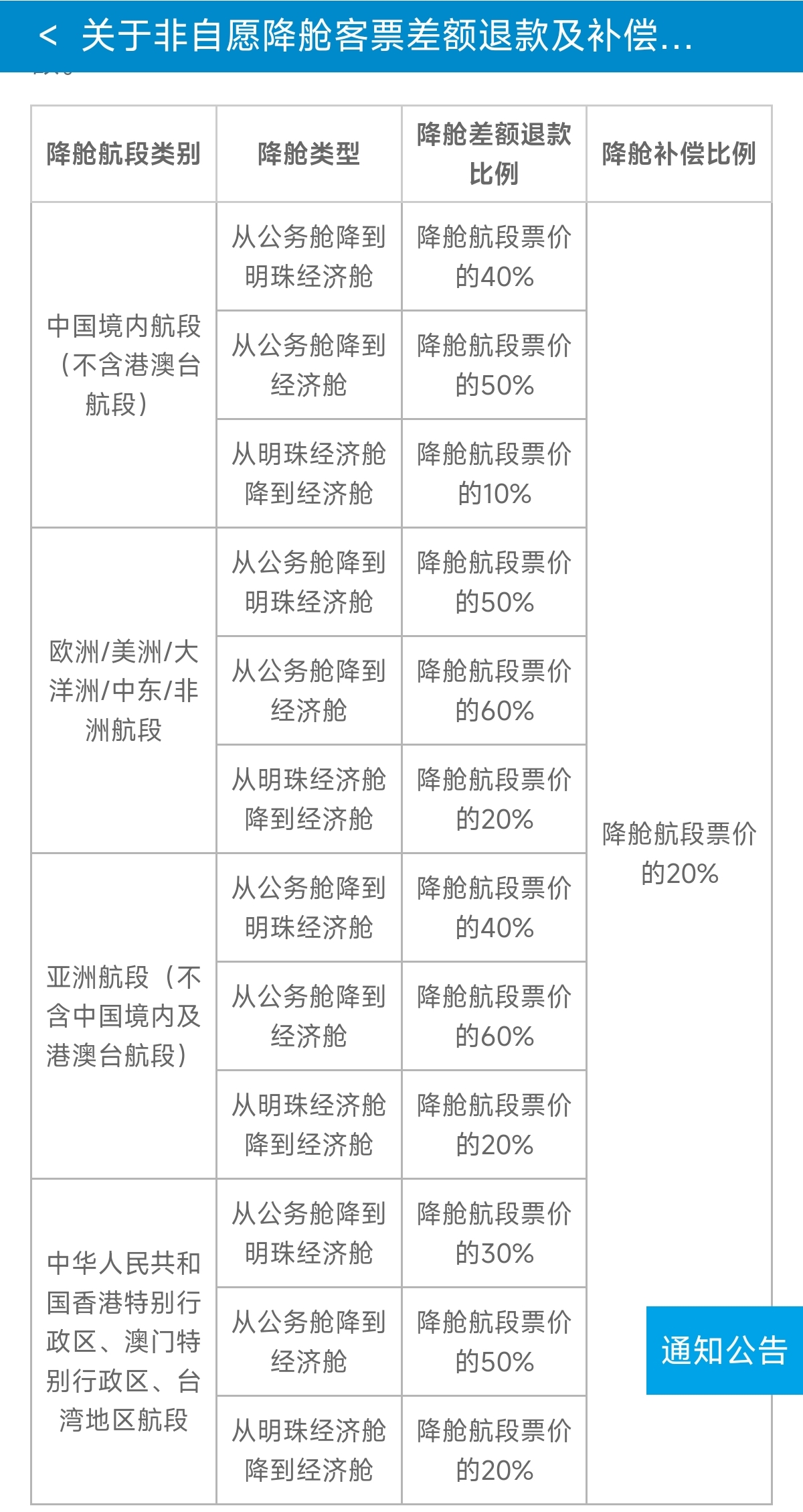 也有航司是基于一定比例进行补偿。如南航,从公务舱降到经济舱的补偿比例为“降舱航段票价的20%”。