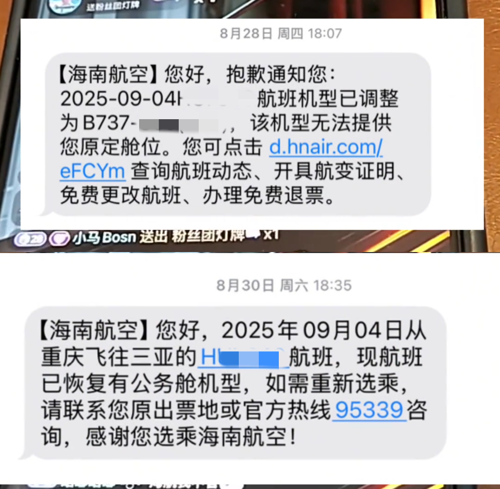 8月28日,他却收到海航的短信通知,被告知由于“机型变更”无法提供原定舱位。