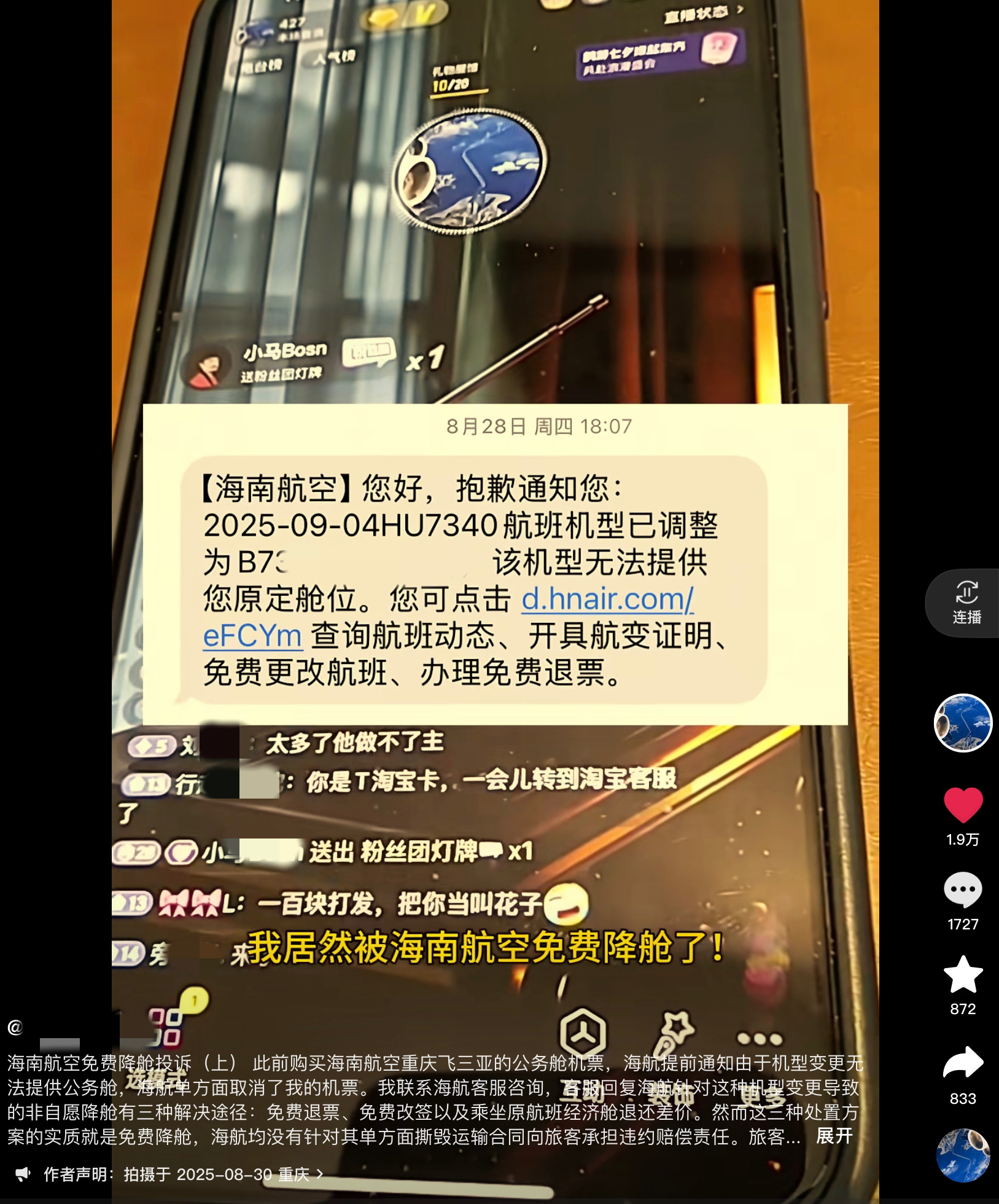 视频发布者孙先生说,他计划9月4日和朋友从重庆飞往三亚,特意购买了海南航空的公务舱机票。